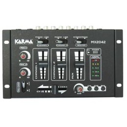 Karma MX-2008. Mixer microfonico 8 canali di ridotte dimensioni,. 8 ingressi di tipo jack 6,3mm per il collegamento di altrettanti segnali. Ogni segnale potrà essere sia microfonico che di linea in quanto, 2 selettori permettono di impostare la giusta impedenza. Dispone di doppio master e di regolazione indipendente di volume per ogni ingresso. Sono presenti 2 led indicanti picchi di segnale e un selettore mono(8 canali)/stereo(4 canali).