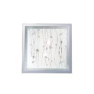 Materiale Vetro superiore con decoro serigrafato. Cornice in vetro trasparente con bordi molati. Viti reggi vetro in metallo cromato.